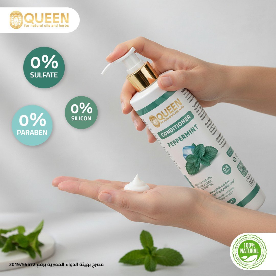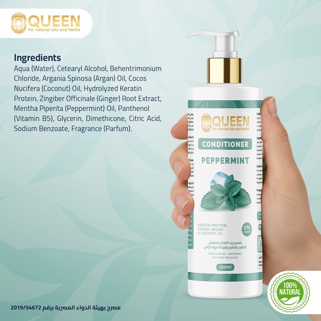 - Queen Conditioner with natural peppermint oil deeply moisturizes hair, helps detangle, and soothes the scalp.